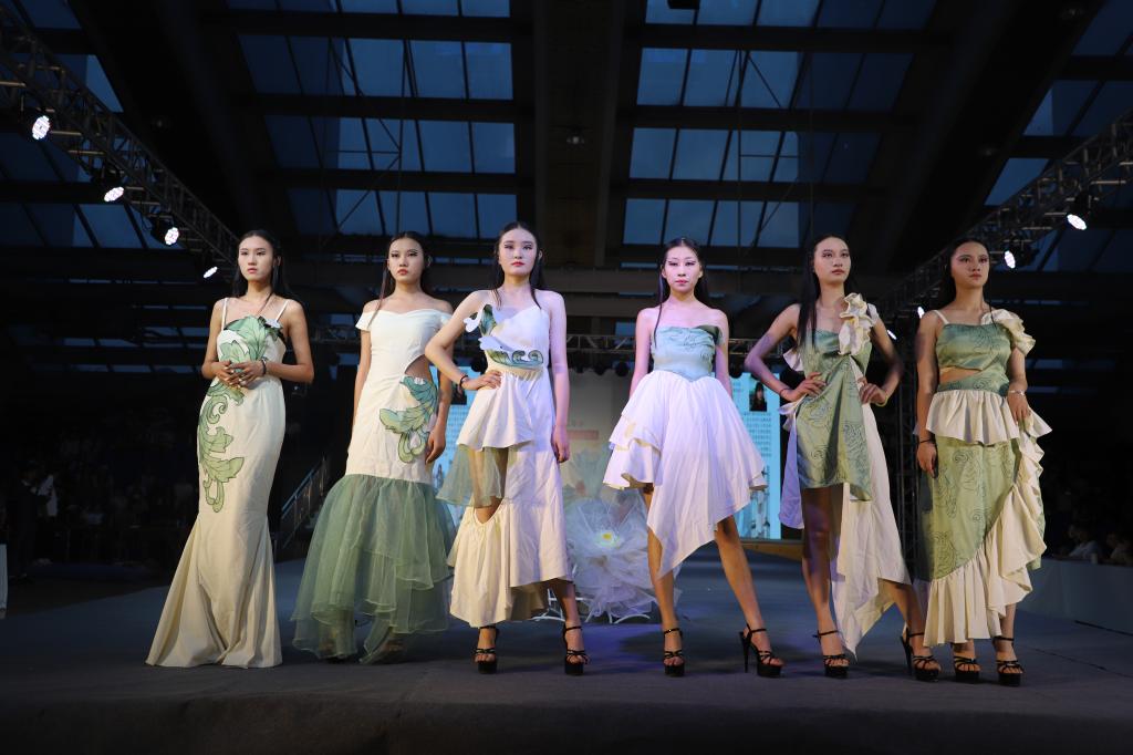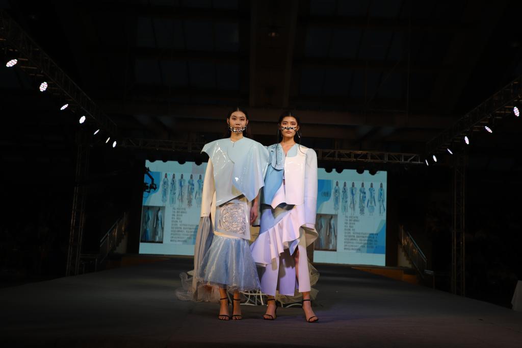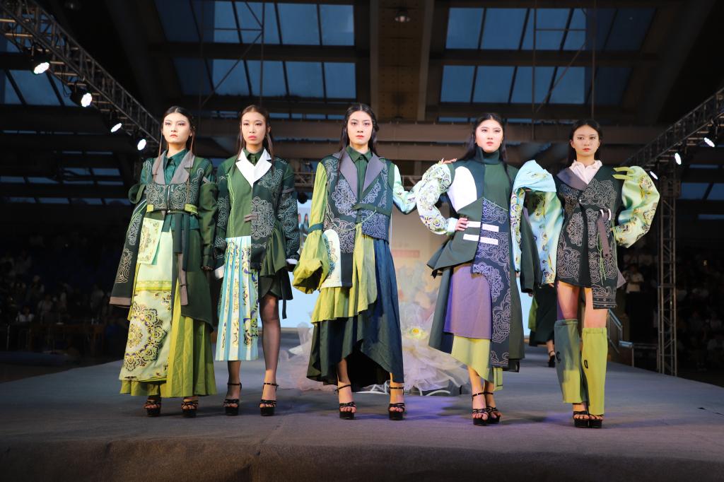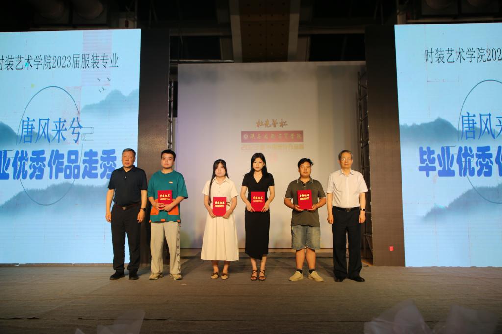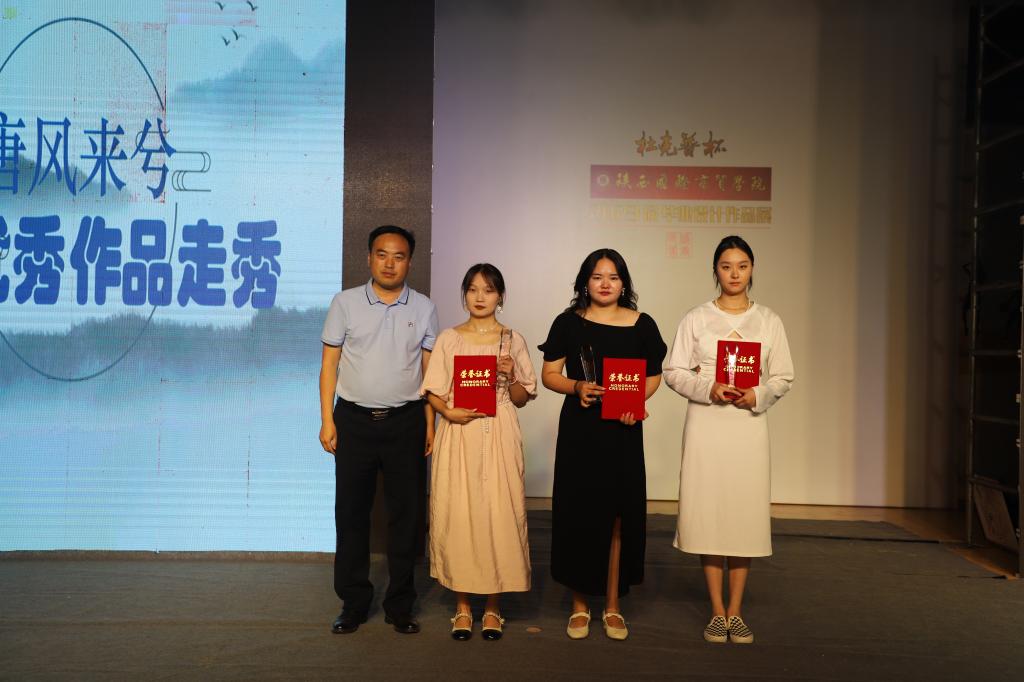 展演结束后,经过评委们的综合评审,最终有11部作品荣登获奖榜单。其中,20号作品《碧水惊秋》获得特等奖,设计师挖掘华丽的唐代佛塔建筑图案元素,以“线”直观展现机械感、立体感,将细腻柔软的马海毛针织面料进行层次堆叠,辅以夸张、填充、交错设计等各类手法技法,实现“刚与柔、力与美”的完美融合,呈现盛唐的雄伟豪迈。26号《红妆》荣获一等奖,作品将盛唐女性妆容特征及色彩元素巧妙提取及再创新应用在女装中,辅以软糯的欧根纱和氨纶面料进行肌理再造,再现女性“以胖为美、独占半边天”的审美魅力。17号、28号作品《叠知芳华》、《影》获二等奖,其中,17号将盛唐时期敦煌莫高窟卷草纹纹样提取重组进行再创新设计,整体以大廓形为主,采用拼接、分割、叠加、镂空表现形式,运用烫画工艺,将青春芳华韵律暗隐在重设的纹样中“浮现”。28号以王维《使至塞上》诗为基调,运用水墨印染、解构、拼接等手法勾勒诗中《影》场景,描写塞外奇异壮丽风景,展现盛唐国人的忧国忧民豪迈和悲壮情绪。