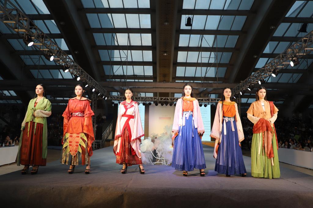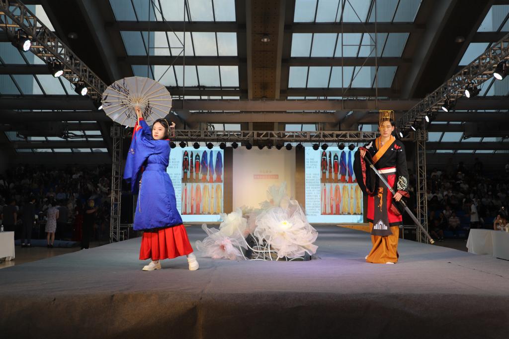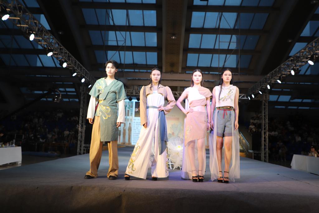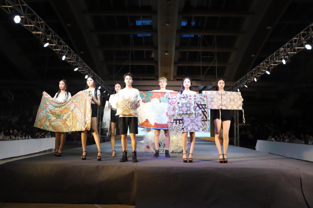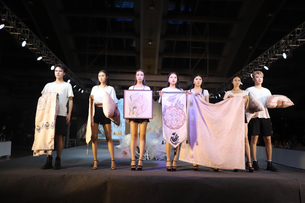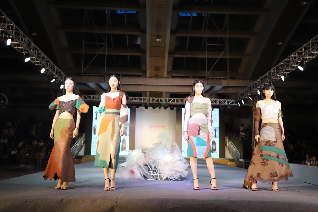 展演结束后,经过评委们的综合评审,最终有11部作品荣登获奖榜单。其中,20号作品《碧水惊秋》获得特等奖,设计师挖掘华丽的唐代佛塔建筑图案元素,以“线”直观展现机械感、立体感,将细腻柔软的马海毛针织面料进行层次堆叠,辅以夸张、填充、交错设计等各类手法技法,实现“刚与柔、力与美”的完美融合,呈现盛唐的雄伟豪迈。26号《红妆》荣获一等奖,作品将盛唐女性妆容特征及色彩元素巧妙提取及再创新应用在女装中,辅以软糯的欧根纱和氨纶面料进行肌理再造,再现女性“以胖为美、独占半边天”的审美魅力。17号、28号作品《叠知芳华》、《影》获二等奖,其中,17号将盛唐时期敦煌莫高窟卷草纹纹样提取重组进行再创新设计,整体以大廓形为主,采用拼接、分割、叠加、镂空表现形式,运用烫画工艺,将青春芳华韵律暗隐在重设的纹样中“浮现”。28号以王维《使至塞上》诗为基调,运用水墨印染、解构、拼接等手法勾勒诗中《影》场景,描写塞外奇异壮丽风景,展现盛唐国人的忧国忧民豪迈和悲壮情绪。