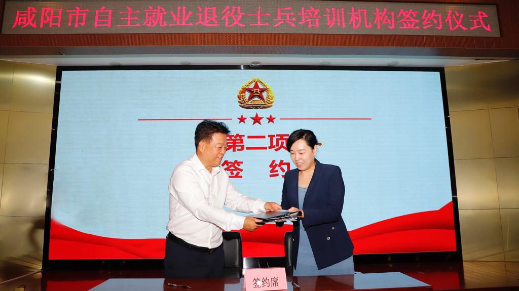 本网讯:9月14日,咸阳市自主就业退役士兵培训机构签约仪式在我校举行。咸阳市退役军人事务局局长刘峰、副局长程清志、各县区退役军人事务局局长及陕西国际商贸学院等六个承训单位的负责同志出席仪式。