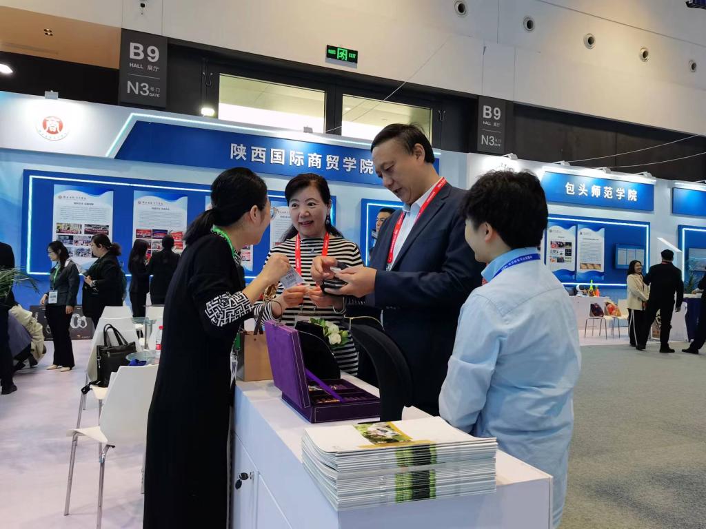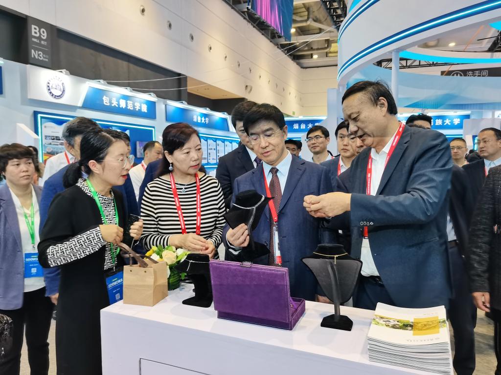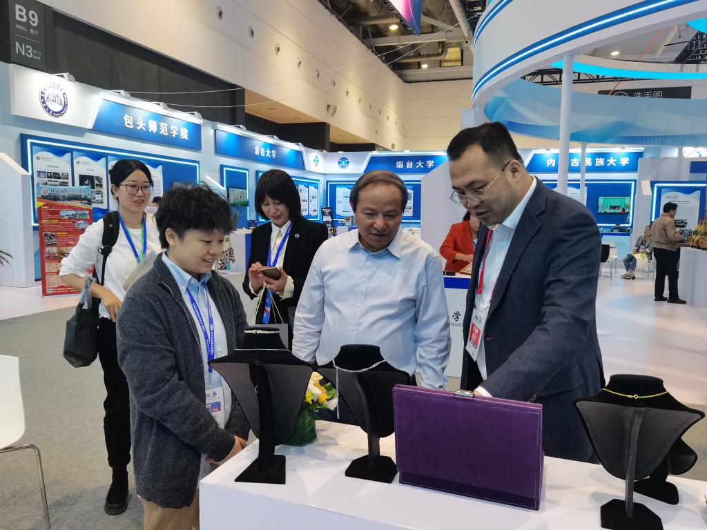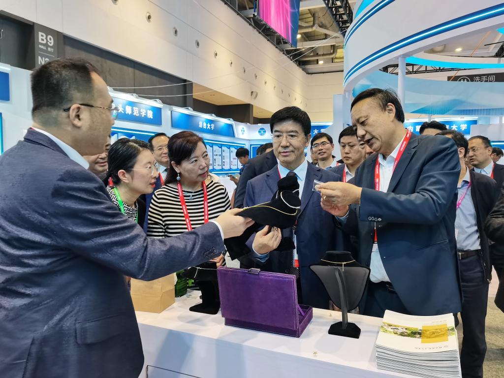 在展览期间,中国高等教育学会会长杜玉波,中国高等教育副会长、天津大学原党委书记李家俊,黑龙江省政协文化文史和学习委员会副主任、黑龙江省委教育工委原常务副书记,省教育厅党组书记、厅长赵国刚,厦门大学教育研究院院长别敦荣等与会领导参观了我校综合展位,在分别听取董事长赵超博士、校长助理王文博的介绍后,纷纷对我校近年来取得的成绩和办学成果、发展特色给予了充分肯定,特别对我校珠宝学院人才培养特色给予高度评价。鼓励学校进一步发挥企业办学优势,坚持走产教融合、科教融汇道路,在应用型人才培养方面取得更大成绩。我校展出的办学成果等也受到了与会兄弟院校、企业和现场观众的广泛关注,参观交流、洽谈合作的人员络绎不绝。