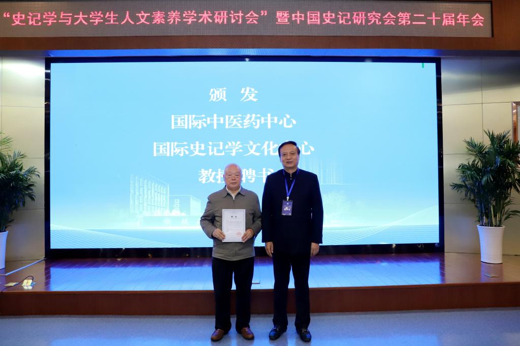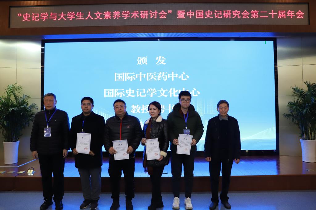 张新科副会长和执行校长贾明远为国际中医药中心、国际史记学文化中心教授代表颁发聘书