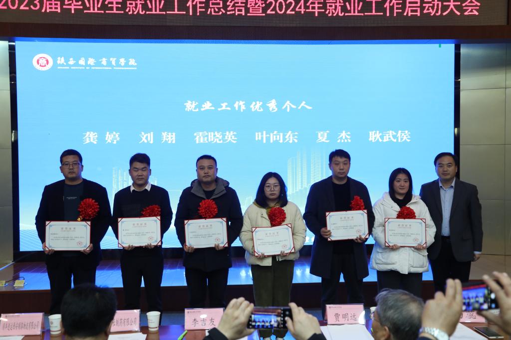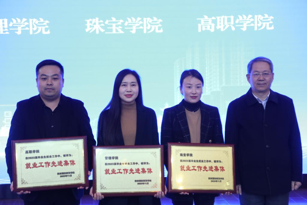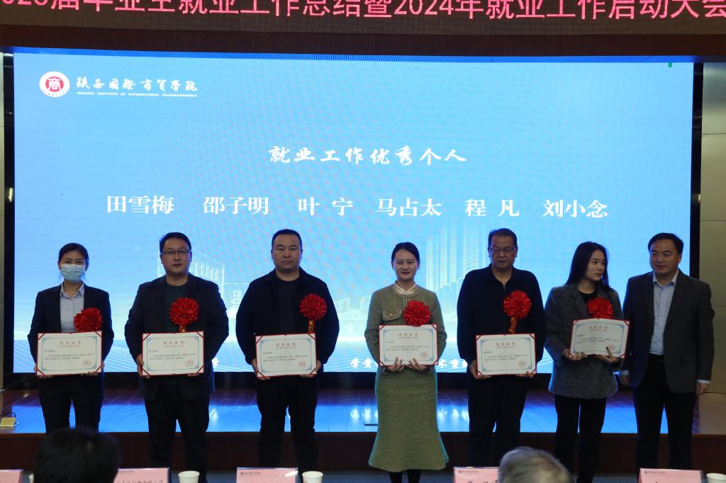 李吉友宣读了《关于表彰2023年就业工作先进集体及优秀个人的决定》表彰文件,龚婷等12人荣获就业工作优秀个人;李晶等3人荣获优秀就业联络员;管理学院、珠宝学院、高职学院荣获就业工作先进集体;医药学院荣获“访企拓岗先进单位”;杨凌步长制药有限公司等五家单位荣获“优质就业基地奖”;秦创原人才大市场荣获“高质量就业服务平台奖”。与会领导为获奖者颁奖。