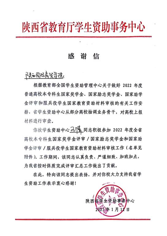 本网讯:近日,陕西省教育厅学生资助事务中心发来感谢信,对我校支持省学生资助工作表示感谢,对我校学生资助中心主任王倩同志在被抽调期间认真工作给予表扬,这不仅仅是一封感谢信,更是对我校资助工作的认可和鼓励。 王倩同志连续2年被抽调到省上参加全省高校本专科生国家奖学金评审工作、服兵役学生国家教育资助材料审核工作,在评审期间,克服困难,吃住在工作点上,加班加点,认真负责,严谨细致,为我省按要求保...