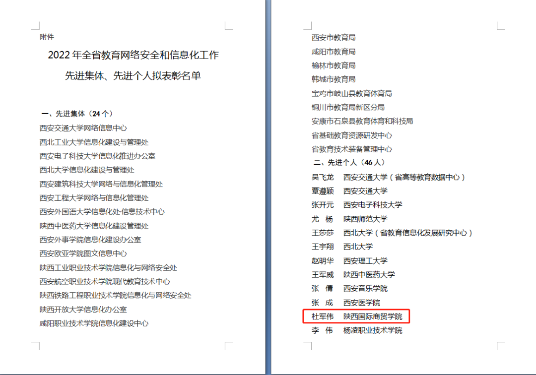 本网讯:近日,陕西省教育厅发布《关于2022年全省教育网络安全和信息化工作先进集体、先进个人拟表彰名单的公示》,公布了陕西省教育网络安全和信息化工作先进集体、先进个人,我校信息化中心杜军伟荣获陕西省教育网络安全和信息化工作先进个人。 该奖项是陕西省教育厅对全省教育网络安全和信息化工作评选的重要奖项,是对信息化规划、信息化建设、信息化成果的重要肯定。本次评选在全省一千多人中最终评选出46人,说...