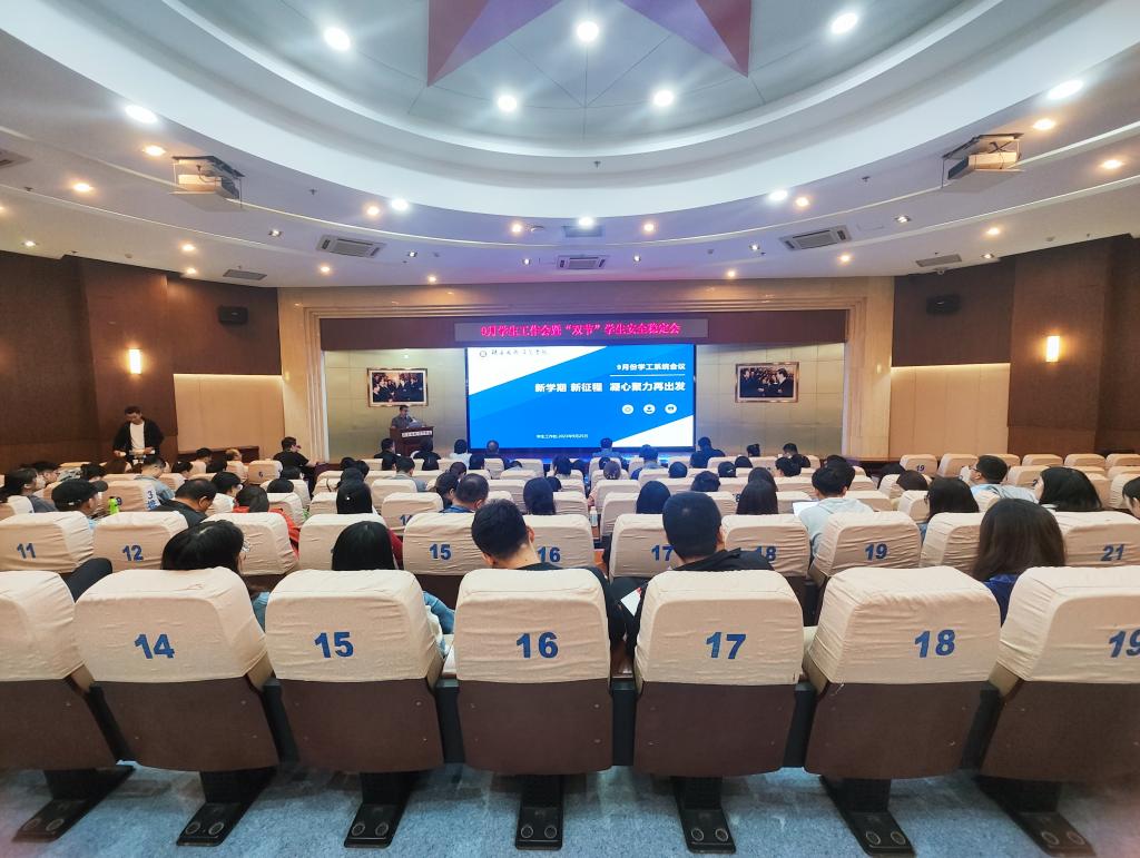 本网讯:9月25日下午,我校在学术报告厅二楼召开9月份学生工作会暨“双节”学生安全稳定会议。学校党委副书记、副校长李吉友出席并讲话,学工系统全体成员参加会议。会议由学生工作处学生管理科负责人主持。会上,学生工作处负责人对9月份学生管理工作做了小结,就“双节”假期学生管理和10月份重点工作做了安排部署。 会议现场李吉友在讲话中对9月份迎新工作、新生军训、入学教育等工作给予充分肯定,要继续坚持以学生为中心的育...