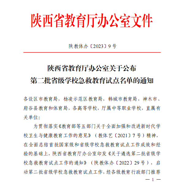 本网讯:近日,根据陕西省教育厅办公室《关于公布第二批省级学校急救教育试点名单的通知》,经省教育厅组织专家评审,我校获批省级急救教育试点学校。本次获批的全省急救教育试点学校共20所。 近年来,学校高度重视师生健康和急救教育工作,充分发挥在人才培养、志愿服务等方面的资源优势,立足实践之基、面向学生之需,配备急救设施、开展应急救护培训,加强应急救护知识普及教育。学校在重点区域已安装急救设施24台,致力于对师...