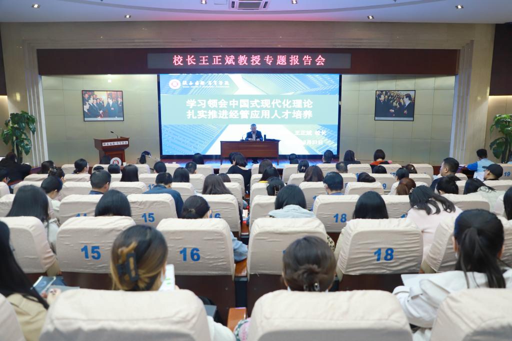 本网讯:3月31日下午,校长王正斌教授以“学习领会中国式现代化理论 扎实推进经管应用型人才培养”为题,为管理学院、国际经济学院和国际教育学院师生宣讲党的二十大精神主题报告。 报告会现场 王正斌指出,党的二十大是在全党全国各族人民迈上全面建设社会主义现代化国家新征程、向第二个百年奋斗目标进军的关键时刻召开的具有开创性、里程碑意义的重要会议,是一次高举旗帜、凝聚力量、团结奋进的大会。大会高举中国...