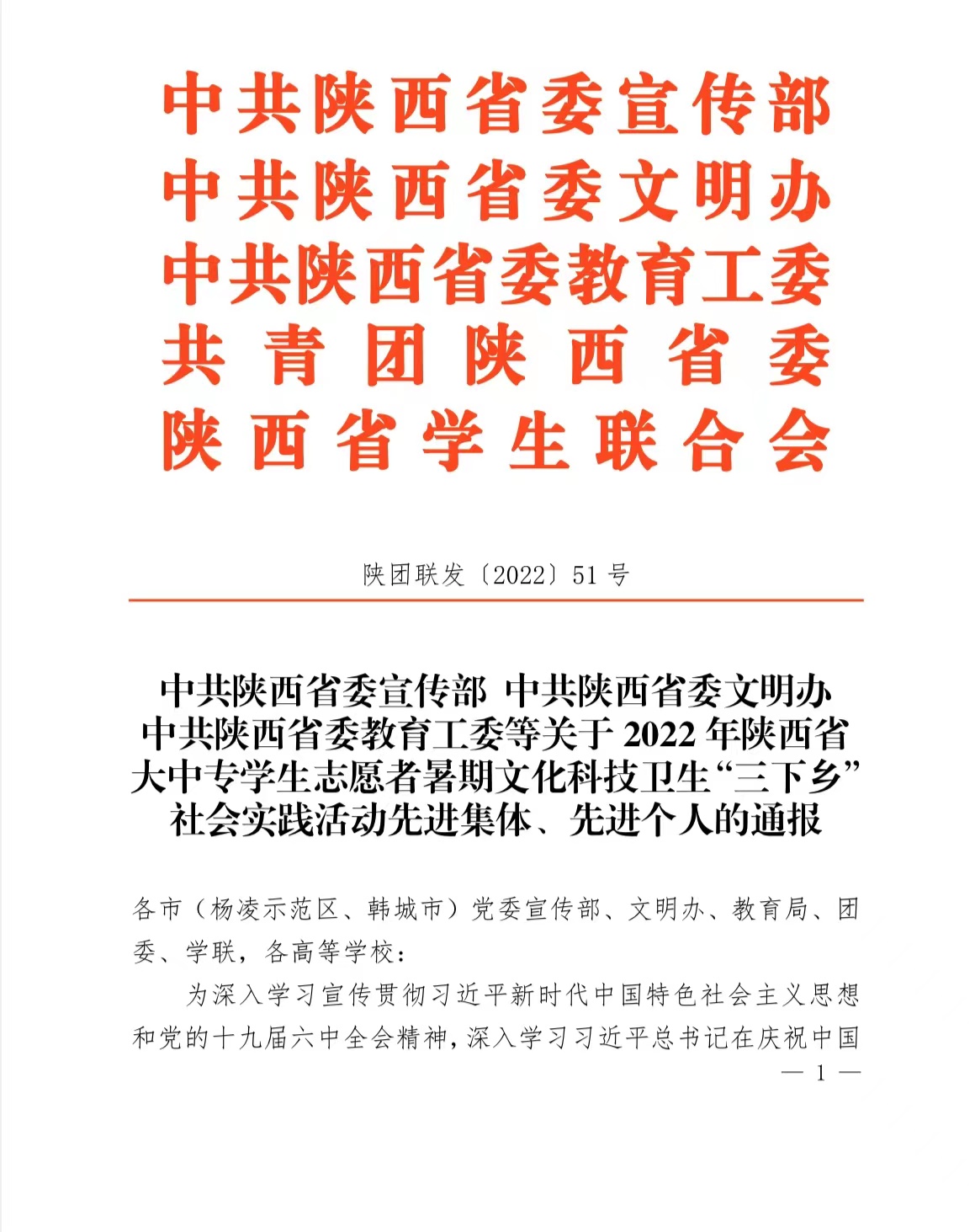 本网讯:近日,中共陕西省委宣传部、中共陕西省委文明办、中共陕西省委教育工委、共青团陕西省委、陕西省学生联合会组织的2022年陕西省大中专学生志愿者暑期文化科技卫生“三下乡”社会实践活动评选结果公布。我校荣膺全省大中专学生志愿者暑期“三下乡”社会实践活动优秀组织单位,并获得多项单项荣誉。 2022年暑期,学校紧密围绕“喜迎二十大、永远跟党走、奋进新征程”主题,共组建实践团队12支,近200余名师生走出校园、走...