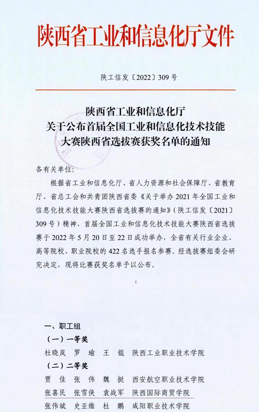 本网讯:9月29日,由陕西省工业和信息化厅、陕西省人力资源和社会保障厅、陕西省教育厅、陕西省总工会、共青团陕西省委联合主办的2021年全国工业和信息化技术技能大赛公布了陕西省选拔赛获奖名单,我校信息工程学院张喜民、张雪侠和袁战军三名教师组成的竞赛团队喜获职工组二等奖。 首届全国工业和信息化技术技能大赛陕西省选拔赛于2022年5月20日至22日成功举办,全省有关行业企业、高等院校、职业院校的422名选手报名参赛。信息工...