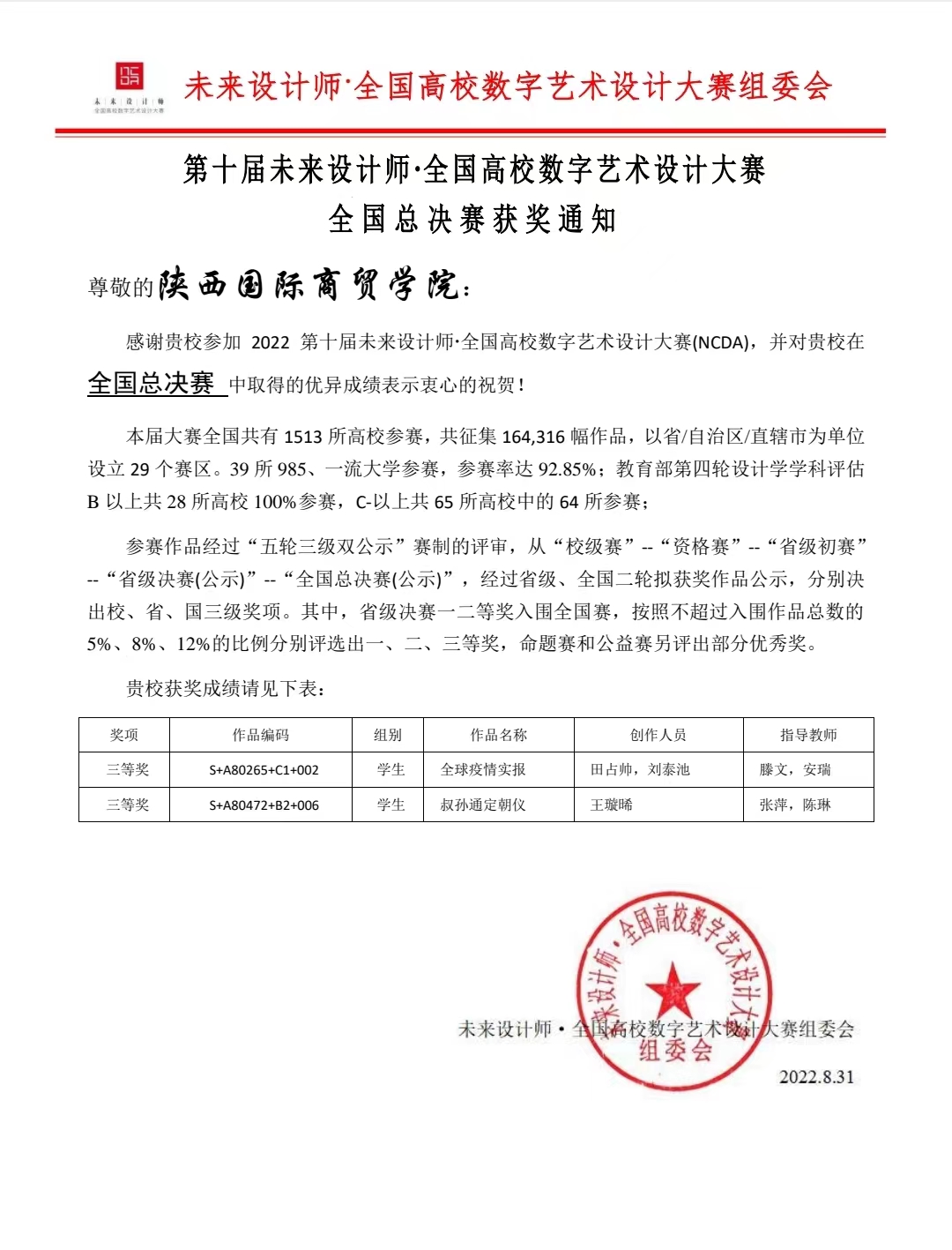本网讯:近日,2022年第十届全国高校数字艺术设计大赛榜单发布,陕西国际商贸学院师生在本次大赛中分别获得全国总决赛三等奖1项,省级赛区一等奖1项、二等奖2项、三等奖3项,成绩优异。 未来设计师•全国高校数字艺术设计大赛(NCDA)是由工业和信息化部人才交流中心和全国高校数字艺术设计大赛组委会联合主办。始于2012年,每年举办一届,已连续举办九届。作为一项高规格、高水平的全国性专业赛事,“学生组”和“教师组”赛事分别...