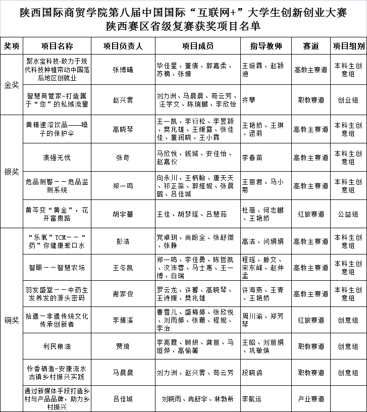 本网讯:近日,陕西省教育厅对第八届中国国际“互联网+”大学生创新创业大赛陕西赛区获奖名单进行了公示,我校参赛团队经过激烈角逐斩获省级金奖2项、银奖4项、铜奖7项,获奖等级和数量取得学校本赛事历史性突破! ——建章立制,完善双创服务保障体系创新创业学院成立由院级层面统一管理,二级学院发挥主体作用的“校院两级”大学生创新创业工作领导小组,实施“一把手工程”,形成了以创新创业学院为主导,二级学院为主体,包括教...