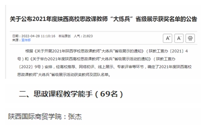 我校教师在2021年度陕西高校思政课教师“大练兵”省级展示活动中荣获“思政课程教学能手”