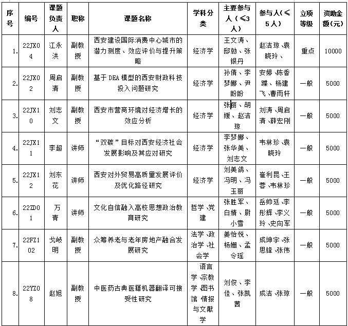 本网讯:近日,2022年度西安市社会科学规划基金课题立项名单公布,我校江永洪副教授“西安建设国际消费中心城市的潜力测度、效应评价与提升策略”等11项课题获批立项,其中:重点项目1项,一般项目9项,自筹项目1项,总资助经费5.5万元。 今年我校共申报西安市社会科学规划基金课题20项,立项率为55%。截至目前,我校共立项西安市社会科学规划基金课题134项。根据西安市社科规划办公室要求,科技处将持续做好立项项目管理工作,下...