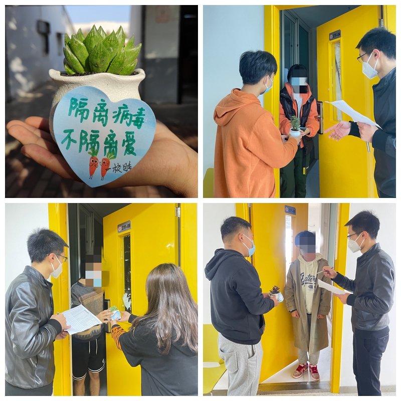 本网讯:按照省市区相关部门防疫要求,以及对密切接触者、次密切接触者、潜在密切接触者、可能暴露者、同时空人员五类人群的管控要求,我校对疫情涉及的潜在密切接触者进行隔离,保障师生的身体健康和生命安全。学校团学组织时刻关心着隔离区的同学们。 10月29日上午10:00学校团学组织志愿者们联合校防疫办为即将隔离结束的同学们送去了爱心绿植,并且在每一束绿植上粘贴了暖心的话语,希望在隔离中的同学们能感受到商院团学组织...
